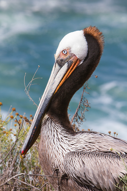 There are more and more pelicans at La Jolla Cove, so they are resting higher up the cliffs and closer to the sidewalk than ever. This one was only about 15 feet away. I had never seen one sit in the bushes before rather than on the rocks.