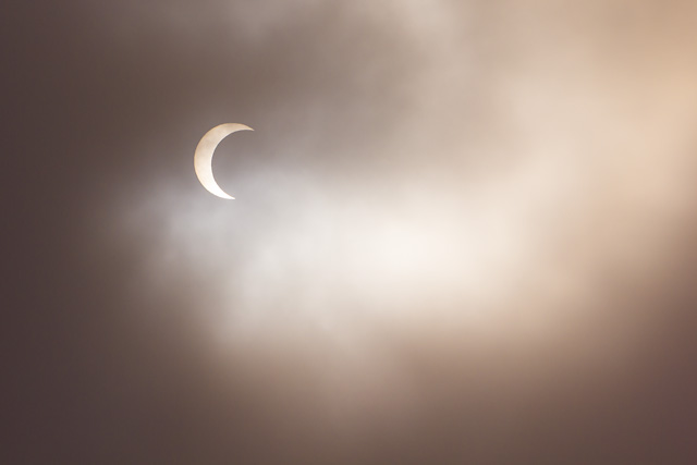 As it was getting closer to the time of the maximum eclipse, the marine layer started coming in. At first I was disappointed, but then I realized that at times the cloud layer was of just the right thickness that it was safe to directly look at the eclipse! Sometimes, a presumed misfortune turns out to be a stroke of good luck!