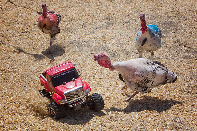 This hilarious husband and wife show features several races in which turkeys chase after a remote control truck (driven by the husband, of course!) with turkey food on the truck bed.