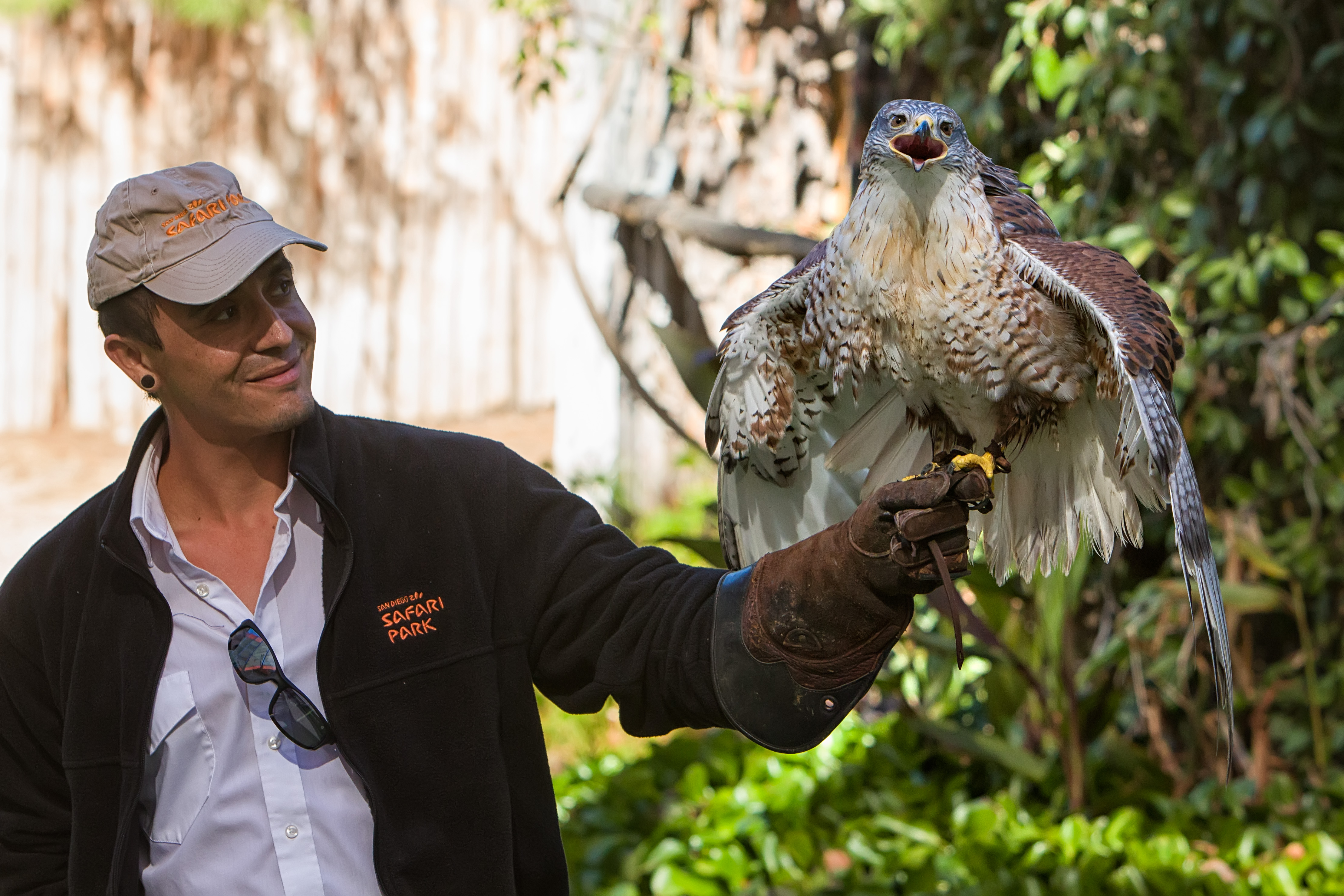 The Safari Park has a wonderful bird show that features many kinds of birds in free flight, often right over the audience’s heads. In this talk, however, they focus on telling visitors how they train the birds to perform their tricks. This hawk was one of the stars of the training talk.